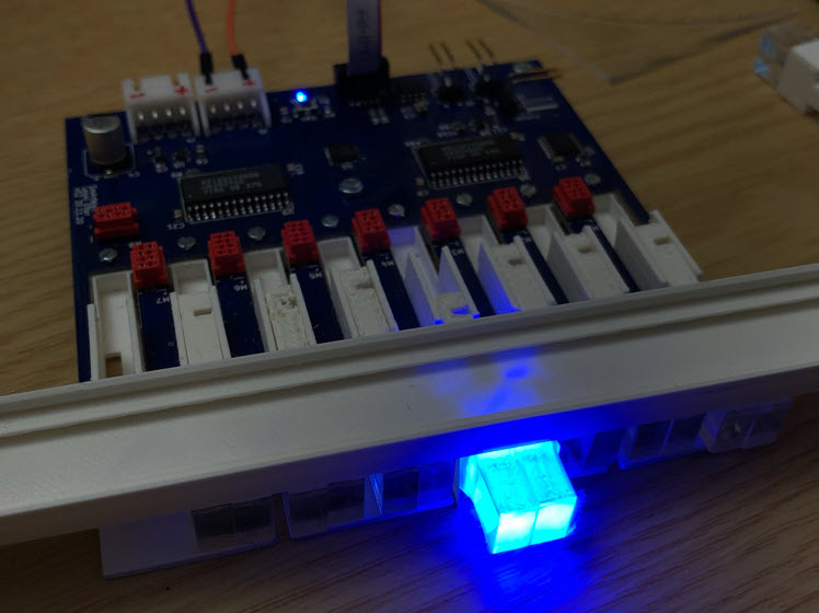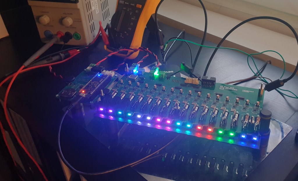 Tests with the pixels were looking good. Below a single pixel, 10 mm ahead of all other pixels in the row: