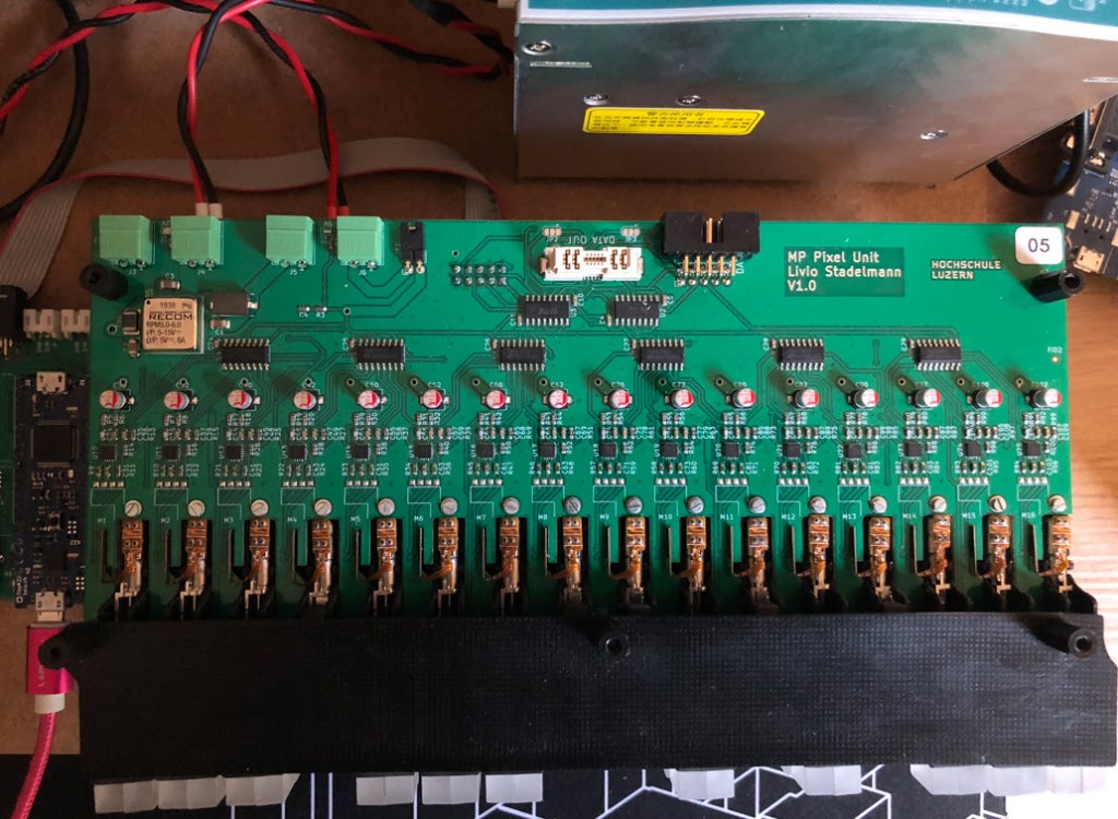 Providing enough power was a concern. In the worst case (all LEDs on, every motor moving, …), the 80 pixels need up to 100 Watt. Because of this a 12V power supply is used, with 5V DC-DC converter on each board (logic and LED supply):