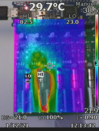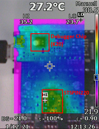 Thermal management was a concern: Passing a constant current of 250 mA through the motor heats it up, up to 80 °C after 1 minute. The motor driver IC remains at around 35 °C.