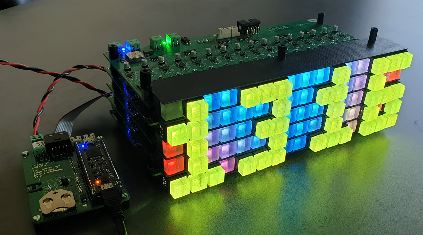 It took longer than expected (1.5 years), with huge help and contributions of three students working on that project: Leoni Etter, Jan Rohrer and Livio Stadelmann. It started with a crazy idea, exploration of different concepts, through solving multiple challenges up to a final working and moving pixel clock: