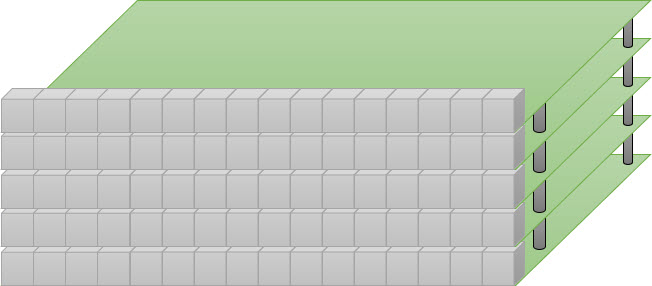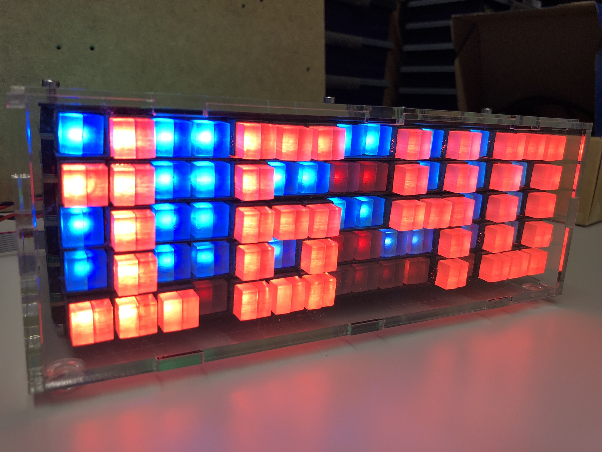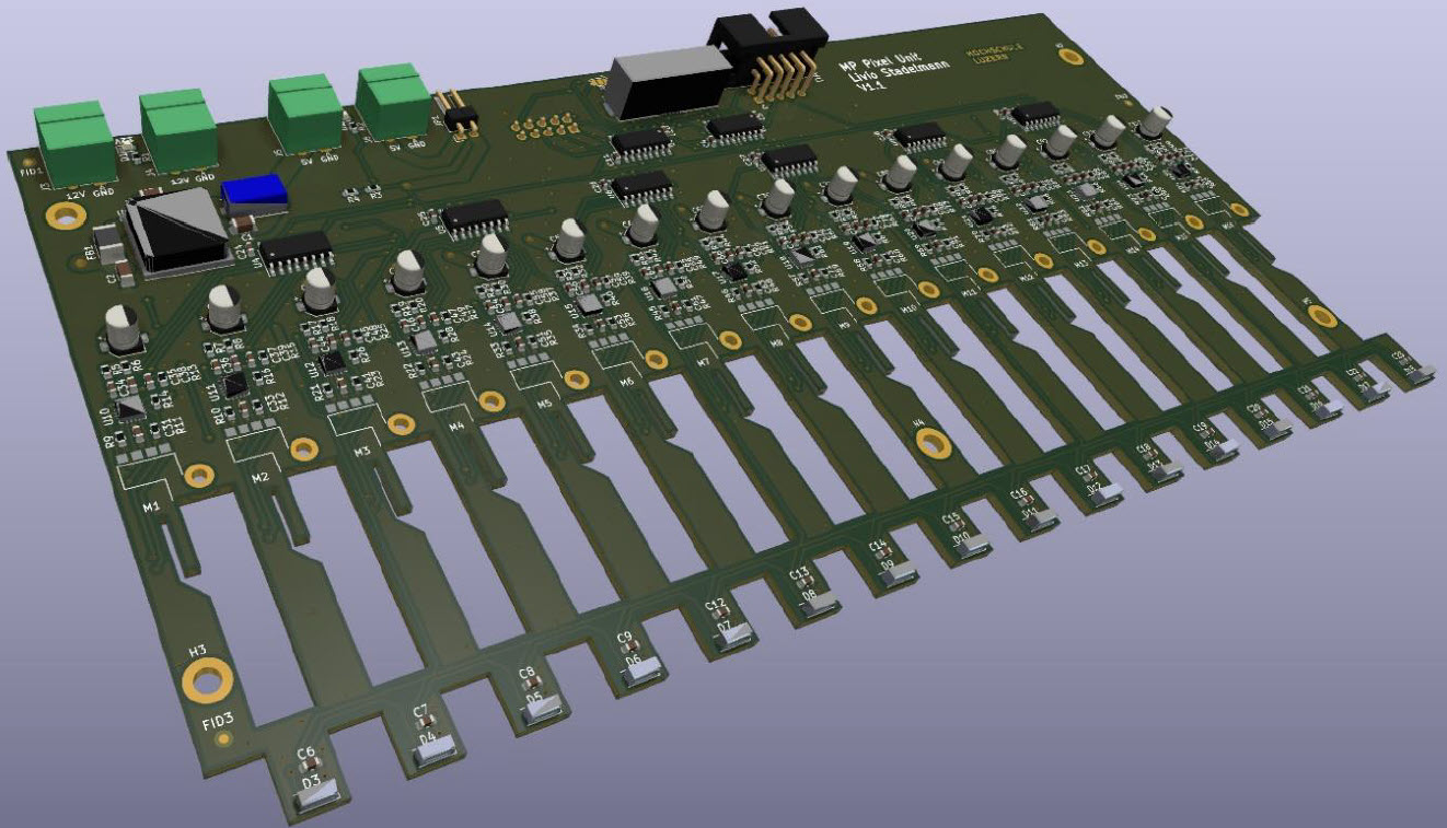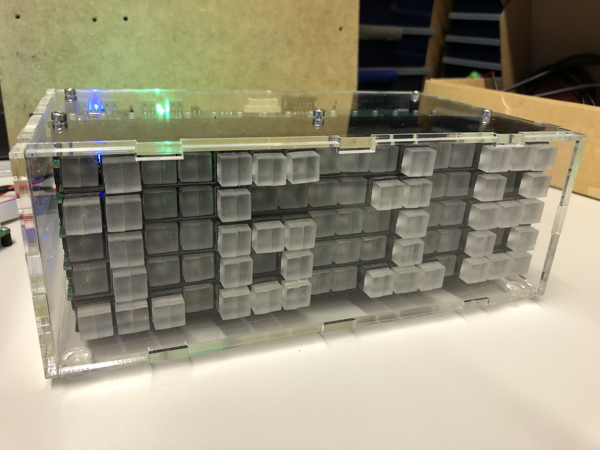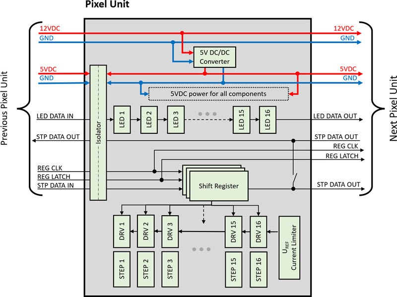 The matrix has 5 layers with 16 pixels in a row, with stacked PCBs each for 16 pixels in a row: