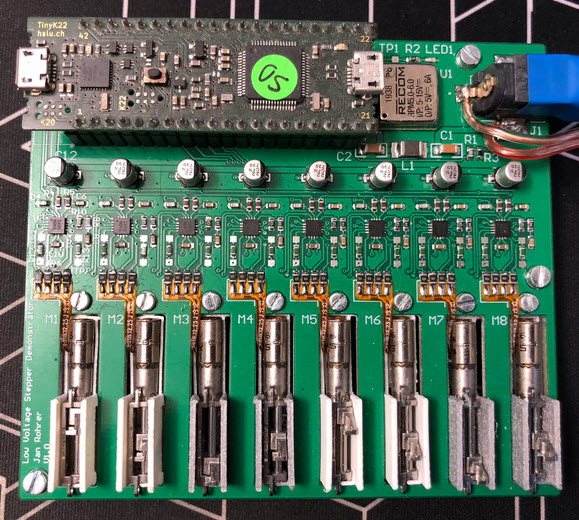 To measure the performance of the driver, a test board with 8 drivers and motors was built. The firmware runs on a tinyK22 board running FreeRTOS using Eclipse/MCUXpresso as IDE.