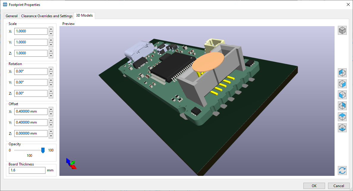 Because it has castellated pins, the PCB can be mounted optionally on the target board, with provided KiCad schematic symbol, footprint and 3D model: