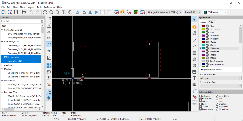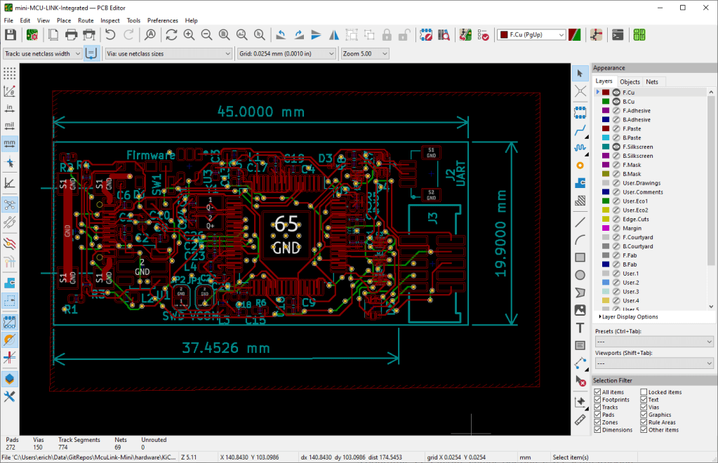 In addition, there is a KiCad schematic and layout your can copy-paste and integrate into your own board design. It includes the SWD debug header (if needed). Without it, it only requires a PCB space of 20×38 mm: