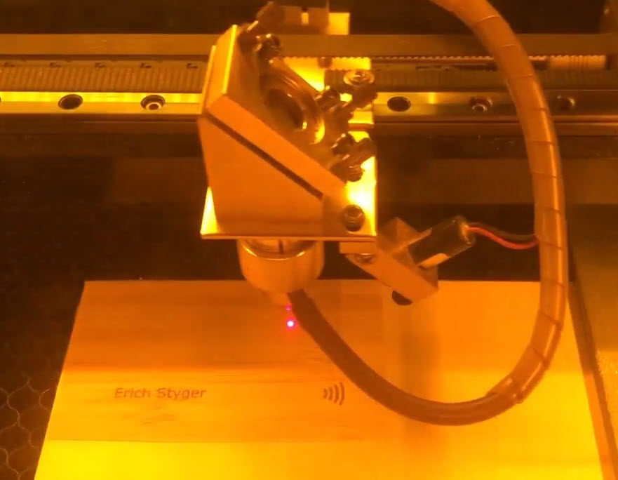 With a laser cutter, plywood, veneer plus NXP NTAG213 RFID stickers, it is easy to create cards which can be read by any modern smartphone: