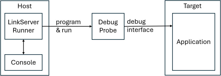 I can load the application with the runner, passing configuration arguments, for example which tests to run. With semihosting or UART I can exchange data, for example getting test output and test results.