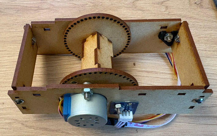 The split flap spools and holder for the motors and sensor are laser-cut out of 3 mm HDF (High Density Fibreboard):