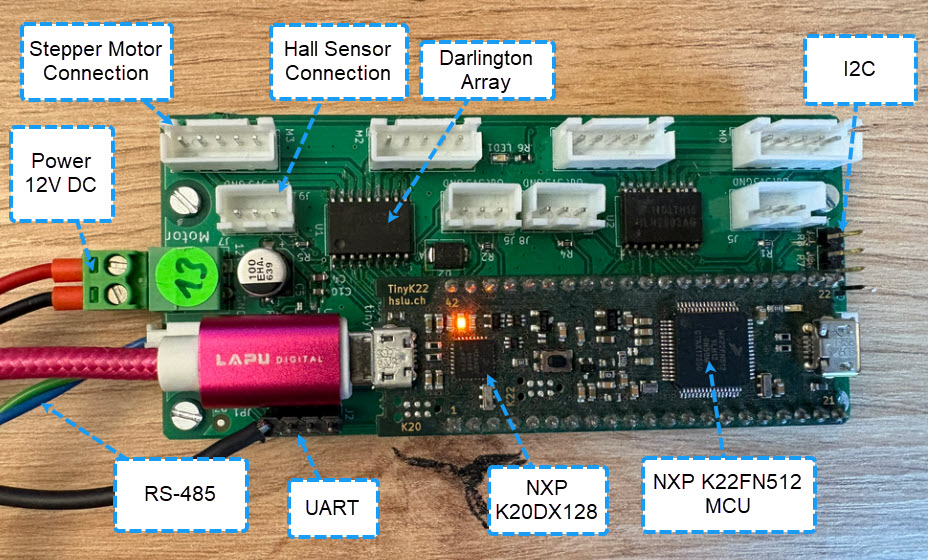 To control the four split flaps, I’m using the K22FN512 micro-controller from NXP, using the tinyK22 breakout board.
