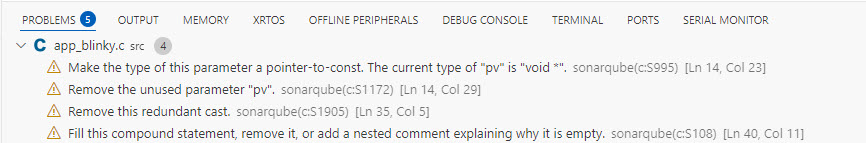 SonarQube scans the source while I’m editing it. Messages are shown int he ‘Problems’ output: