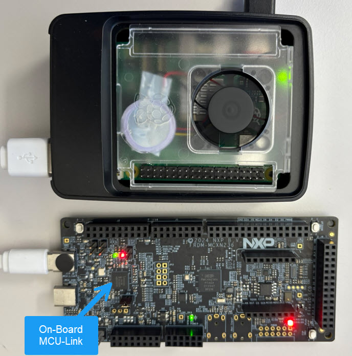 Connect the NXP MCU-Link debug probe to one of the USB ports of the Raspberry Pi.