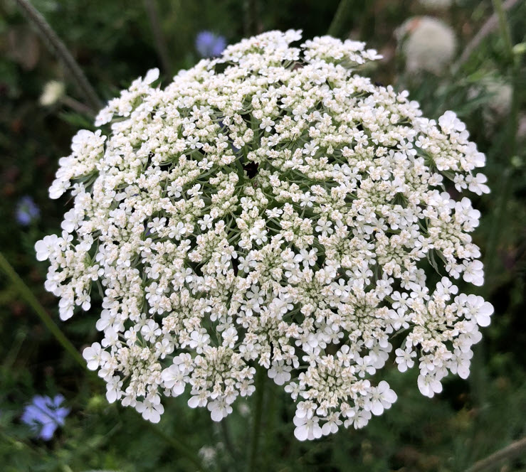 Wild carrot is the ancestor of the modern cultivated carrot. Its flower head often has a black dot right in the center. This mysterious dot is thought to mimic an insect. Which could create the illusion for insects that other insects are already feeding there.