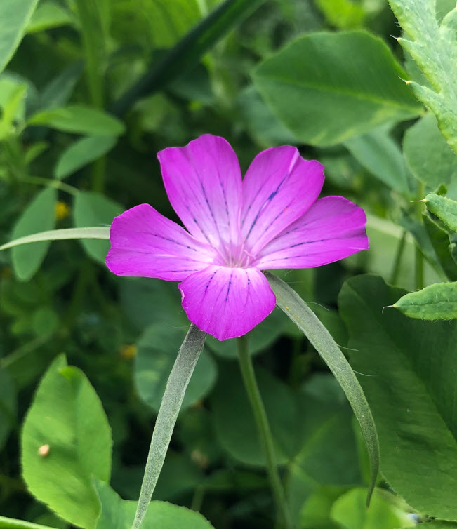 The ‘Kornelke’ was once a common wildflower in European grain fields. Today it is rare in the wild because of seed cleaning and herbicide use. It is a beautiful flower, but all parts are toxic, especially the seeds. That’s why it was important to remove the seeds from the grain harvest. But it is an important flower for bees and other insects.