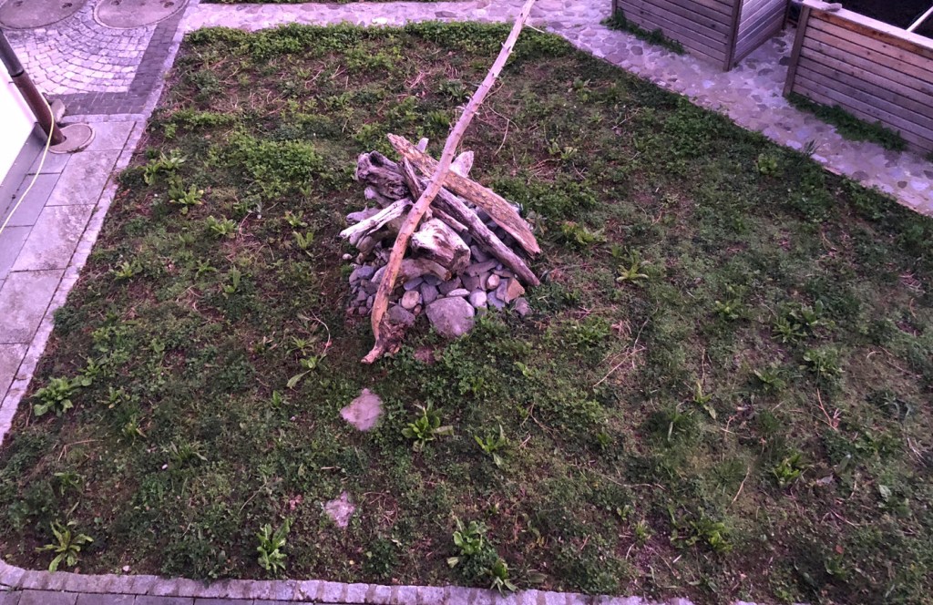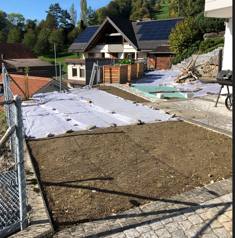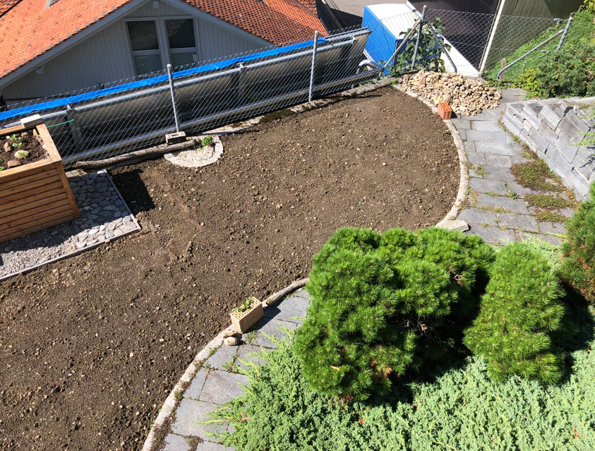 Dug up the ground for about 20 cm. Removed bigger stones and piled them with tree branches. You can see that pile in the next picture on the right. The soil has been degraded with lots of sand to create an unfertilized meadow. In a perfect world, probably the whole soil would have been replaced. But that was not economical, and adding lots of sand was a compromise. Added around 100 kg sand per square meter. Seeded the soil with a special wildflower seed mix and covered it to protect against birds picking them up.