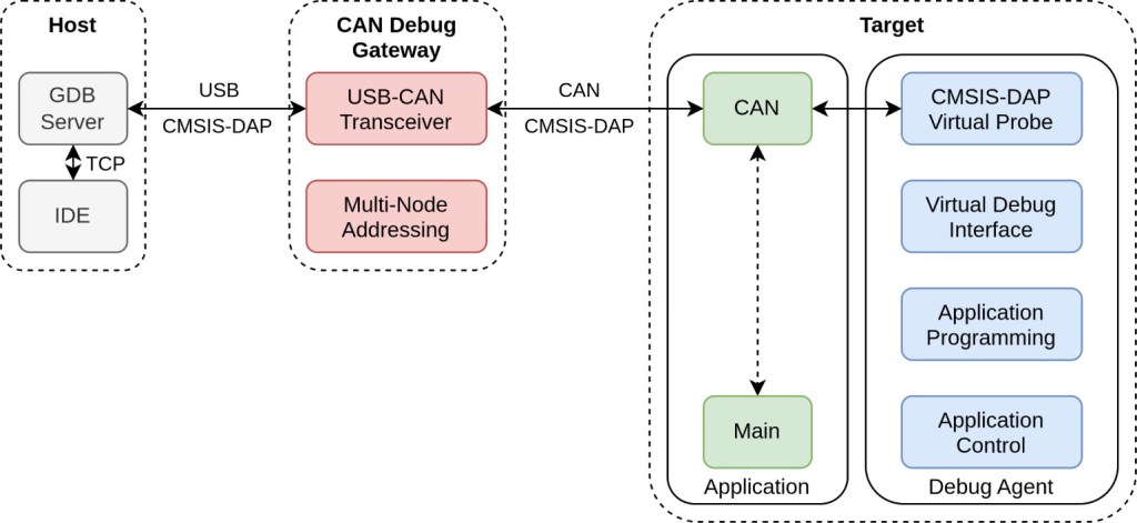 • Target: One or more devices on the CAN bus or CAN nodes which then get debugged. The node is linked with a small debug agent which implements a virtual CMSIS-DAP debug probe. The debug agent includes standard debugging features (read/write memory and hardware registers, stopping the target, stepping). The agent library or framework includes an optional flash programming module.