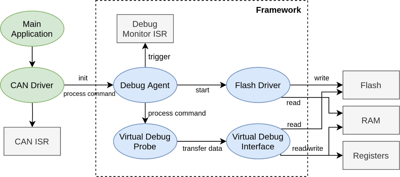 The application CAN Driver/Stack initializes the framework. From the CAN interrupt, CMSIS-DAP Messages for the debug framework are passed to the Debug Agent. The framework utilizes the special Debug Monitor Interrupt which is implemented on all ARM Cortex-M except the ARM Cortex-M0/M0+.