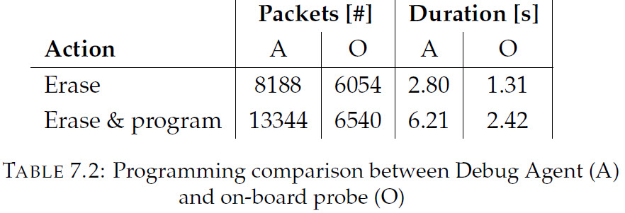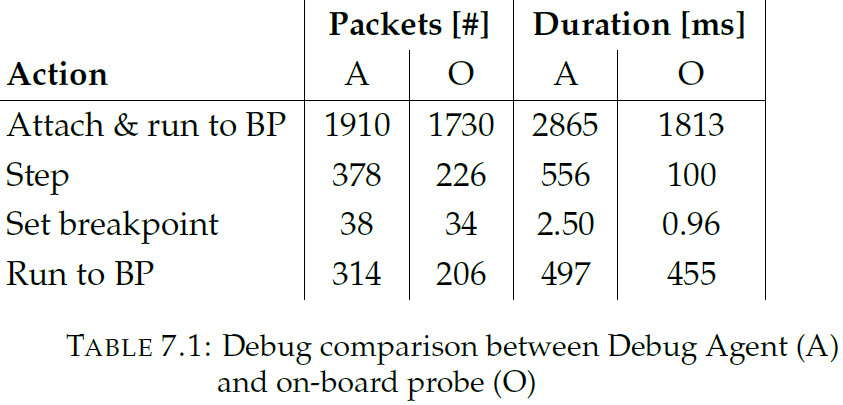 The measure the performance, debugging with the on-board probe (O) and the debug monitor agent (A) has been performed. For this, the number of CMSIS-DAP/CAN packets (max size 64 bytes) has been counted. Additionally the time for typical action has been measured: