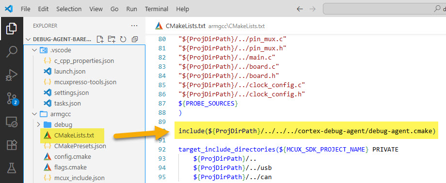 In case the DebugMonitor and framework shall support flash programming, it needs to stay in RAM. Linker scripts are provided to place the framework in RAM. Below it shows an example for the MCXN947 MCU.