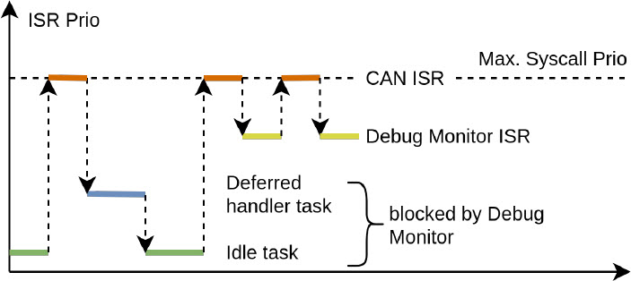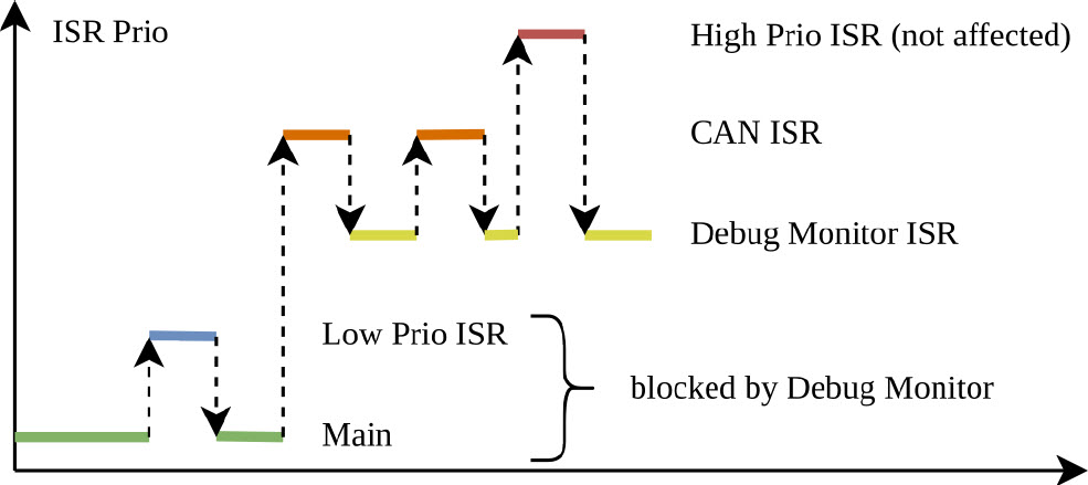 There are two important interrupts in the target system: the communication (CAN) interrupt and the DebugMonitor interrupt.