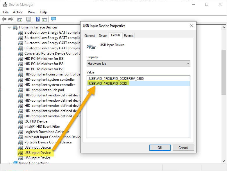 The board enumerates as USB HID with VID 0x1FC9 and PID 0x0022: