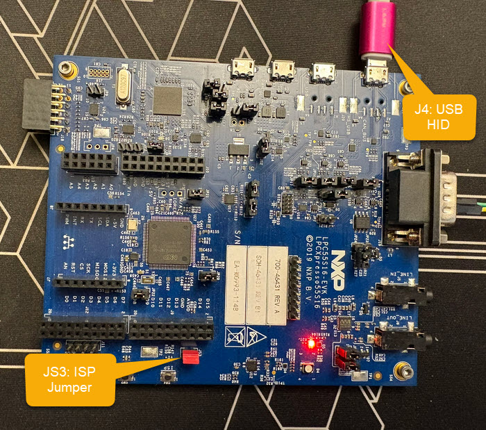To show how to use rblhost, here an example for the LPC55S16-EVK. See Using CAN FD for Remote Hardware Debugging of Cortex-M Devices. To enter ISP mode, I set the ISP JS3 jumper. Then connect the USB cable on J4 to power the board.