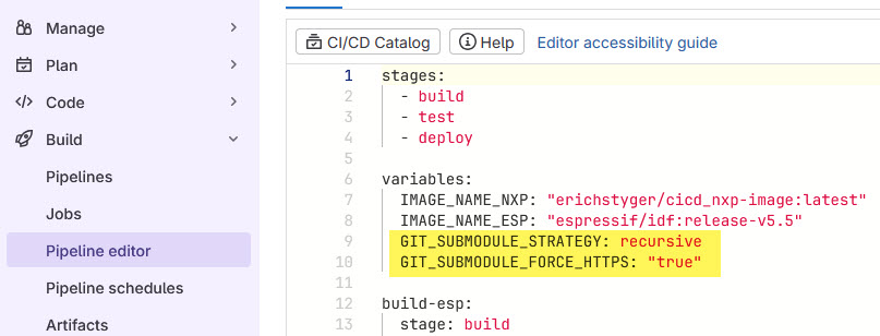 The last thing is about not using SSH, but HTTPS access instead. In addition to the recursive GIT_SUBMODULE_STRATEGY strategy, I have to force using HTTPS in the .gitlab-ci.yml: