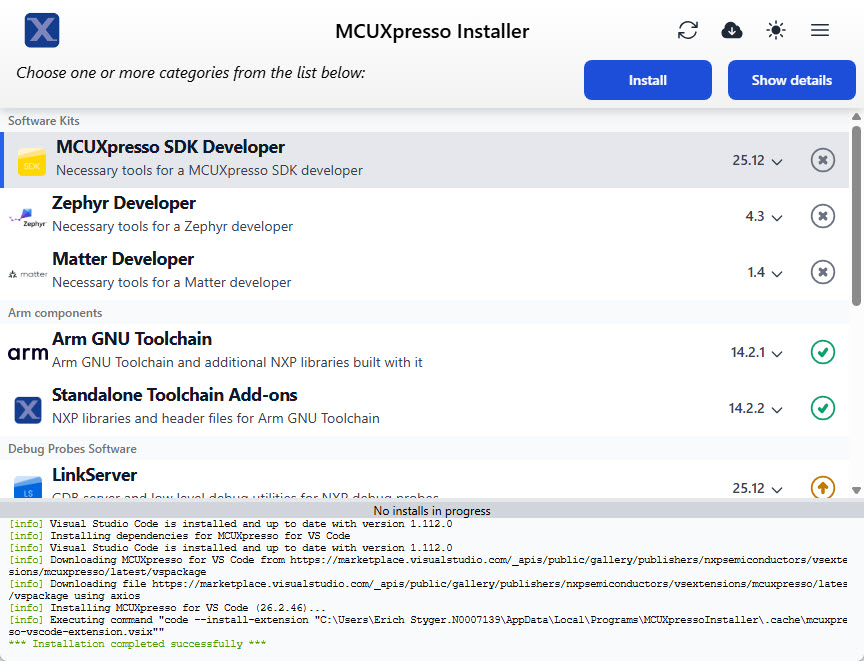 In the installer, install the ‘MCUXpresso SDK Developer’ kit: