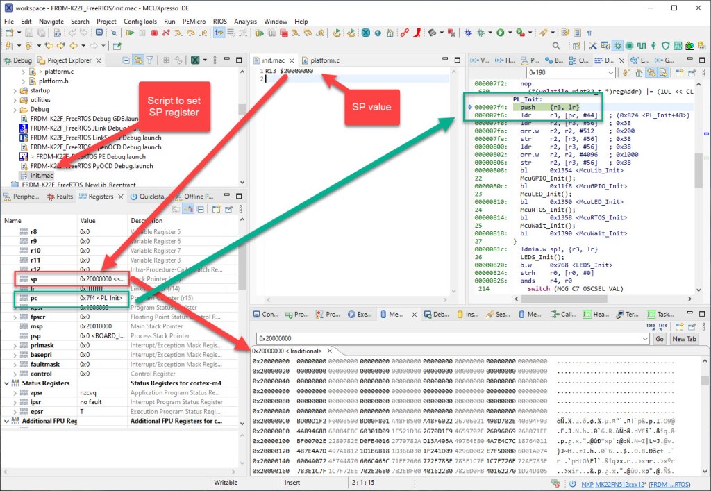 By default, the debugger cares about the initial register settings after connecting to the target. But for special cases like using a bootloader combined with a loaded application, this requires a bit more than the usually ‘standard procedure’. For example I need to set both a custom program counter (PC) and stack pointer (SP).