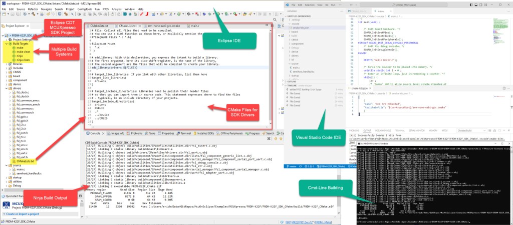 Key to this is CMake: I’m keeping the Eclipse CDT features, adding CMake with Make and Ninja to the fix, and have it ‘ruled’ by three different ’emperor’: Eclipse, Visual Studio Code and from a shell console: