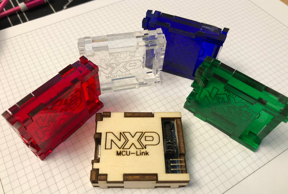 The MCU-Link debug probe comes without an enclosure. To protect the hardware against ESD issues, I had created a 3D printed enclosure for it. That one worked fine, but takes some time to print it. If you have to build many enclosures for a full classroom setup, then a laser cutter is much faster. And to create some variations, I have decided to cut it with different materials and colors. To be environment friendly, extra glue is needed, and with recycled PMMA, different colors are possible too.