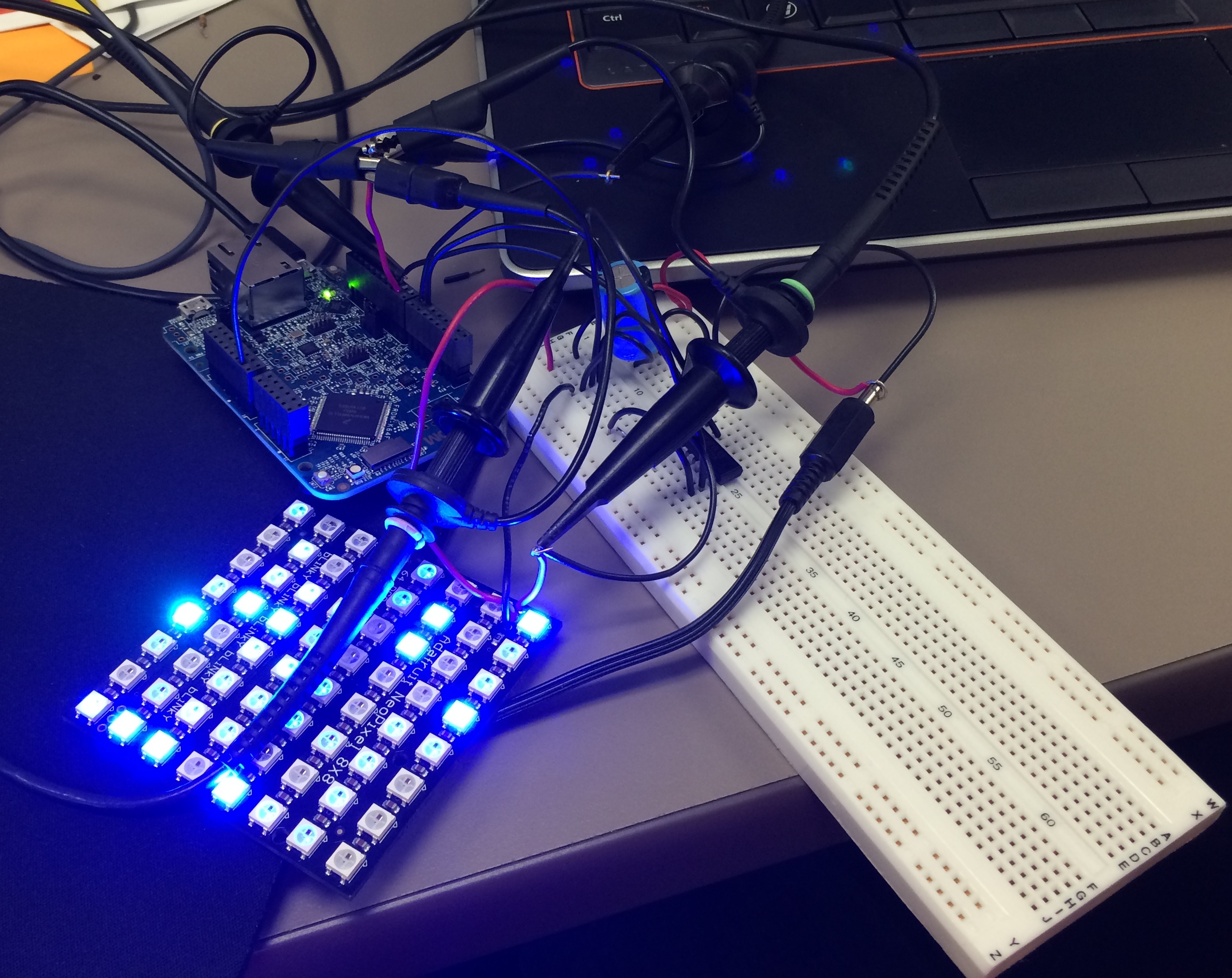 Well as far as my project for neopixels using FRDM-K64F is concerned, Erich wrote the wonderful tutorial for all of us to turn on the NeoMatrix. I tried my hands on that and I was indeed able to turn on the board but not in the way I wanted it to. 😦 So, it turns out that I got few LEDs turning blue or some turning green. I asked Erich about it and I got to know that it is because I screwed up with the timing signals. I was using an oscilloscope and not a logic analyzer but Erich’s recommendation was to use the Logic Analyzer. This was the result of my experiment following Erich’s tutorials.