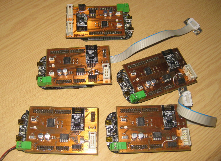 The five boards are the first set of prototypes with a FRDM-KL25Z for a battery operated wireless sensor network based on the nRF24L01+ 2.4GHz transceiver.